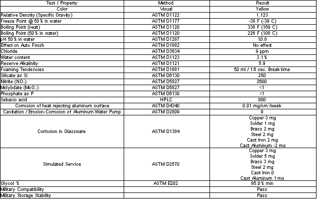 | Corrosion in Glassware | ASTM D1384 | Copper 3 mg Solder 1 mg Brass 2 mg Steel 2 mg Cast Iron 2 mg Cast Aluminum -2 mg |